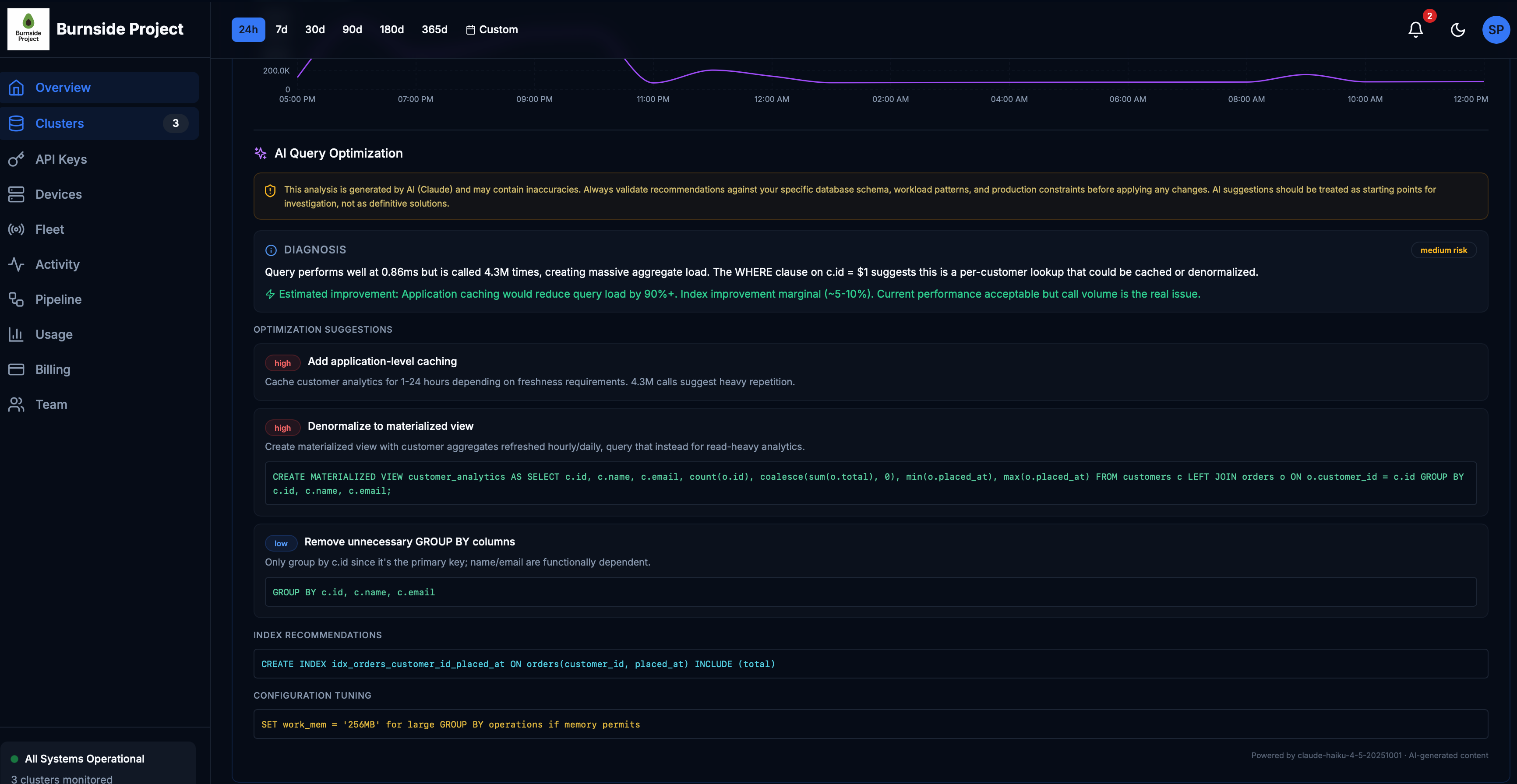 AI diagnoses your slowest queries with specific SQL recommendations. Index suggestions, materialized views, configuration tuning — all generated from your actual workload patterns.